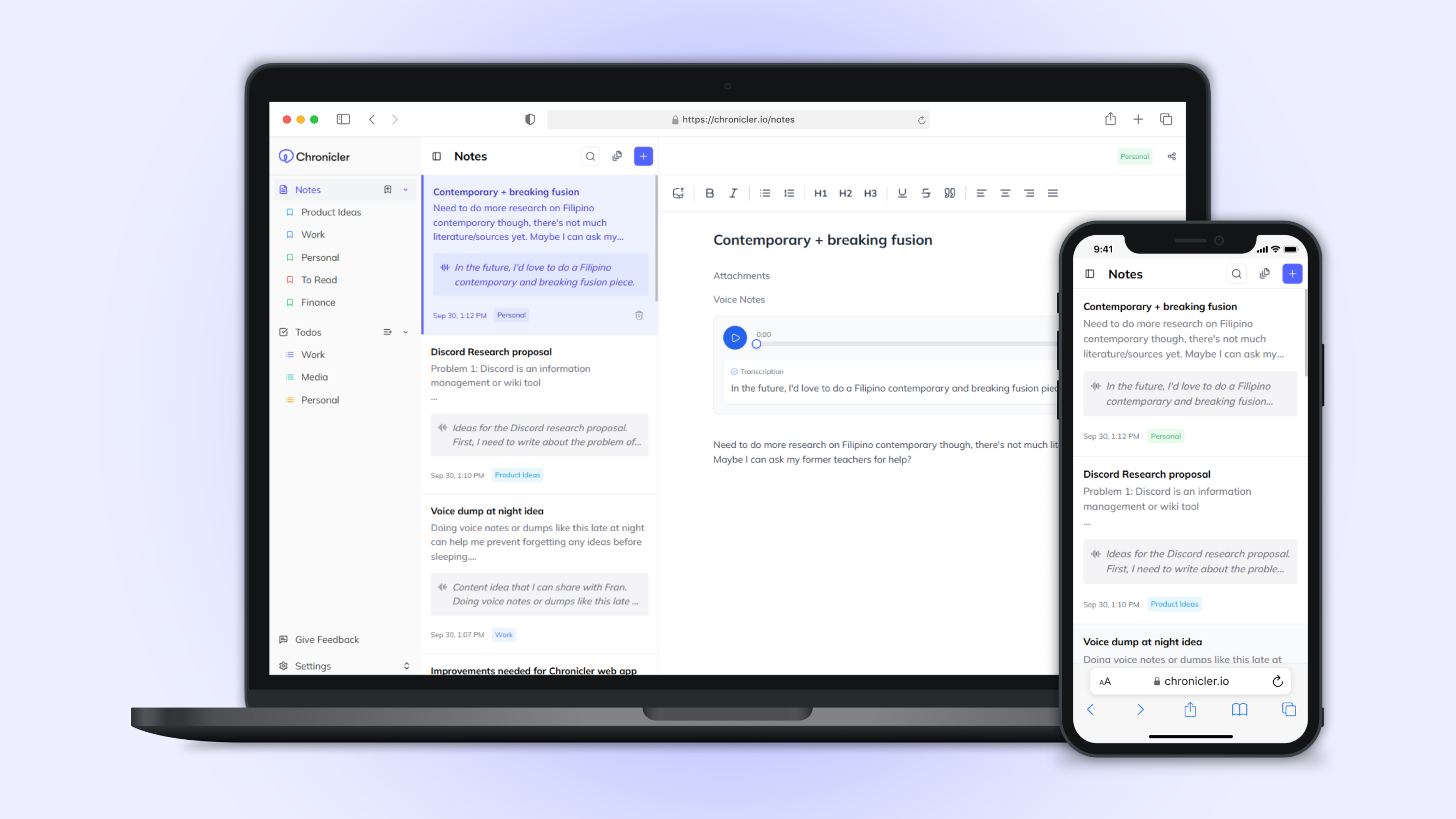 For users who mainly use Chronicler to save notes, the web app serves as a place where they can easily review all that they've saved so far. This is also where they can refine their ideas further; users can flesh out initial ideas with rich text formatting, and efficiently manage their collection by using bulk actions to tag or delete multiple notes simultaneously.
