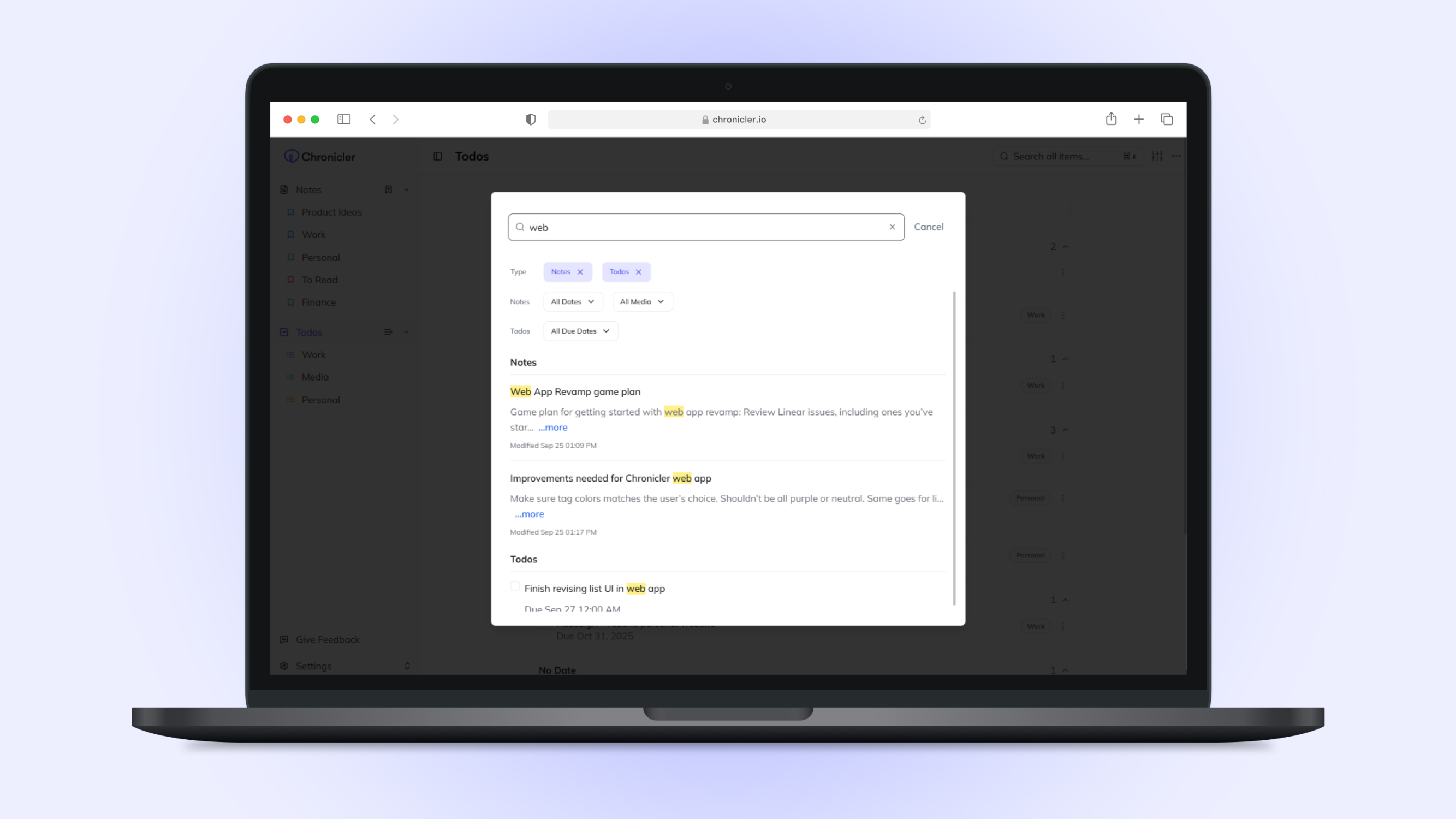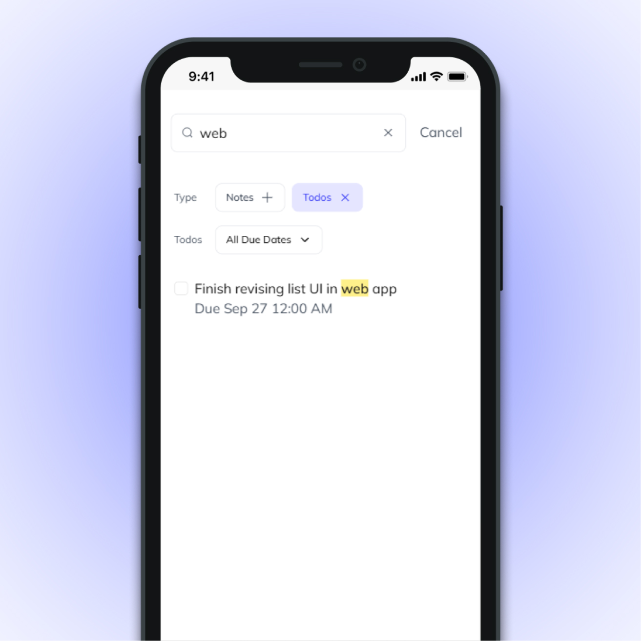 They can also filter the search depending on what type they are searching across. Notes can be filtered based on attached media and creation date. Meanwhile, todos can be filtered based on due date.