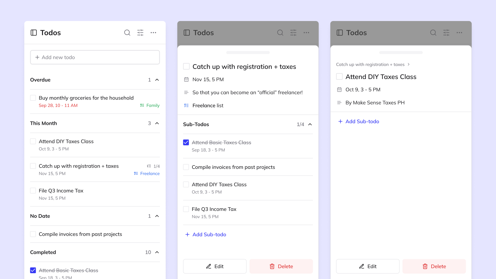 - Footer: Houses primary actions like "Edit" and "Delete" for the parent todo.