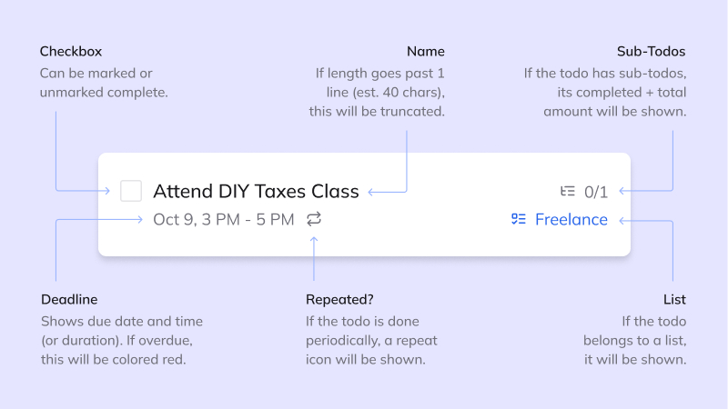 - Content: Displays the main todo's core properties (due date, list, and a new description field) along with a dedicated sub-todos section