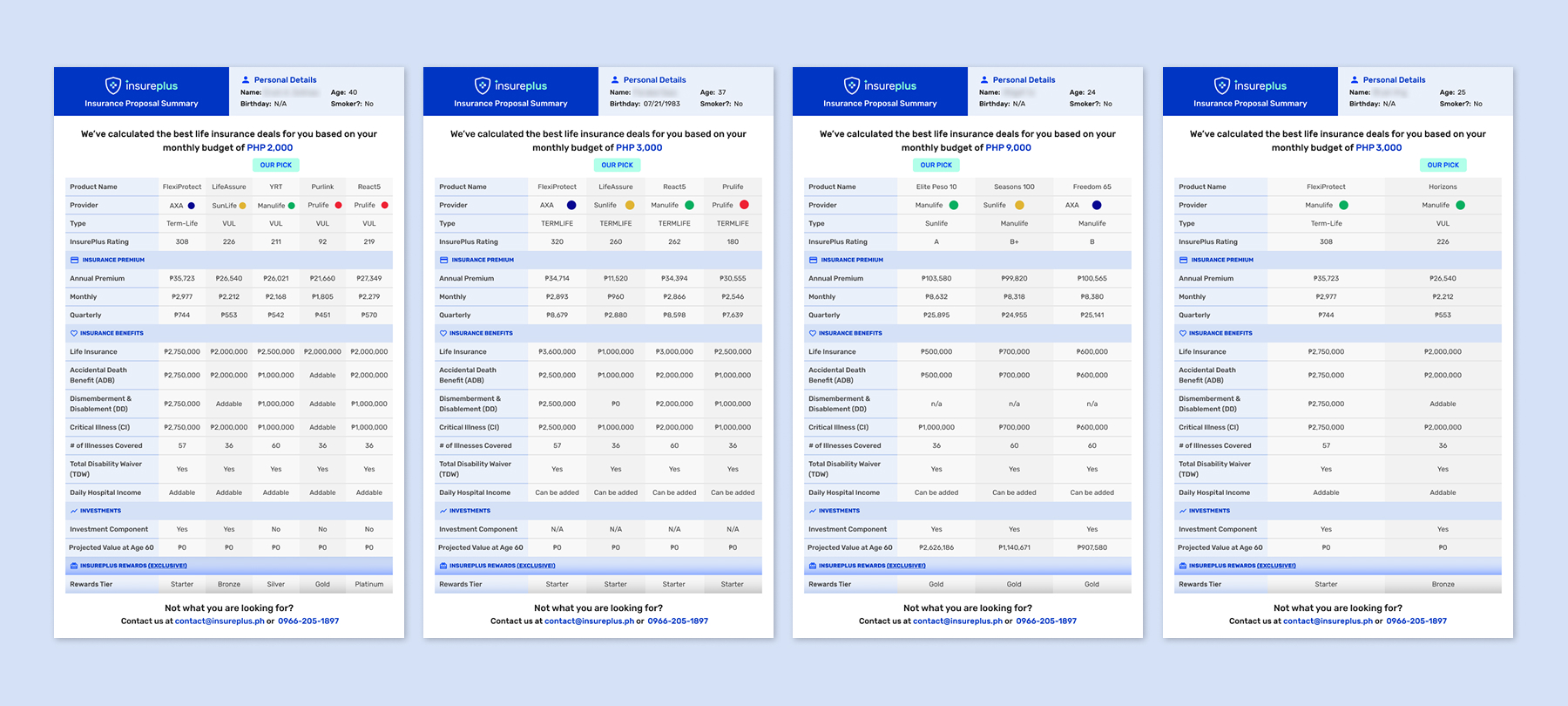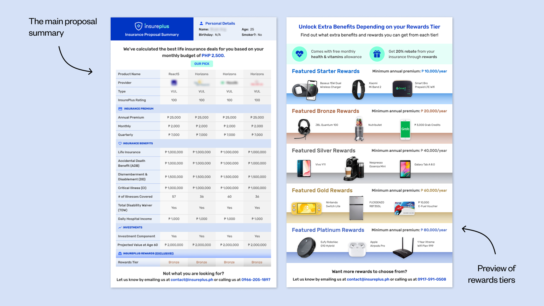 Accompanying the main proposal summary is a preview of the rewards tiers they could avail through the InsurePlus program.