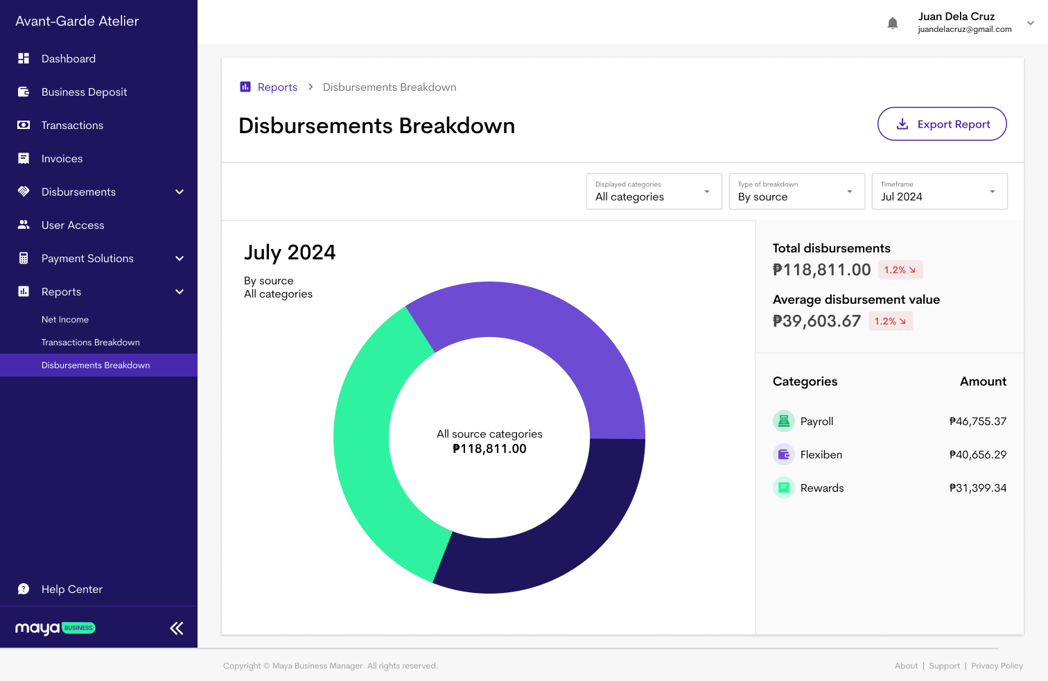 - For Maya Business, this would look like Report dashboards (based on transactions + disbursements) 📊