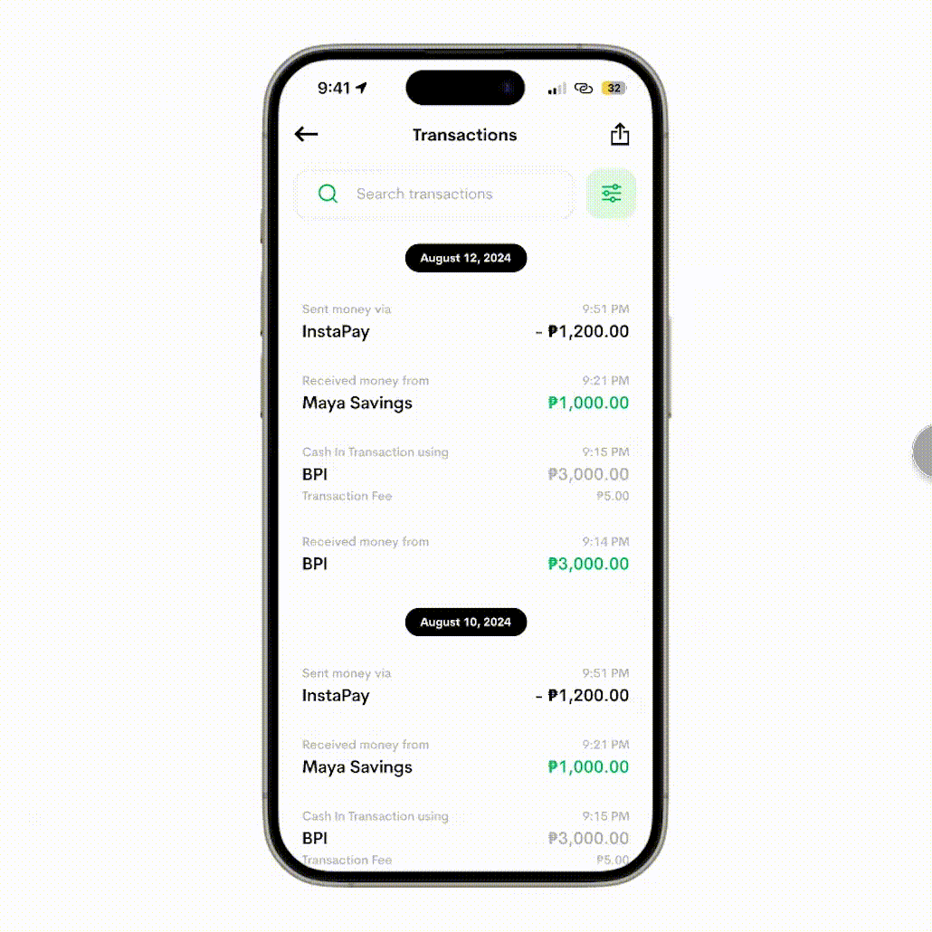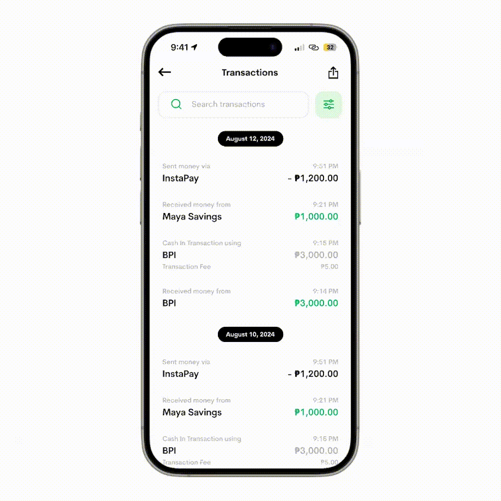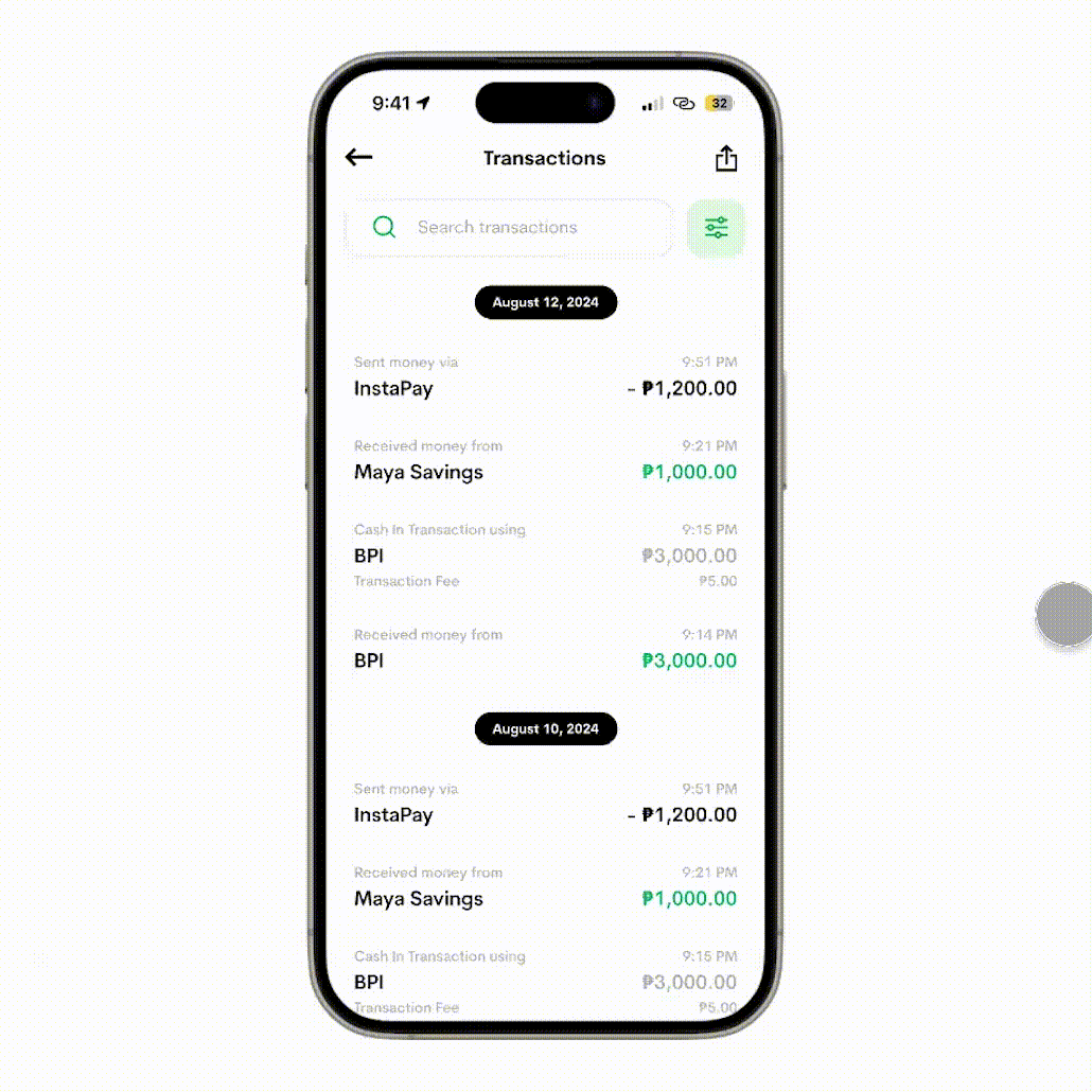 Maya Personal users cannot search or filter transactions. It’d be hard to find an old/specific one.